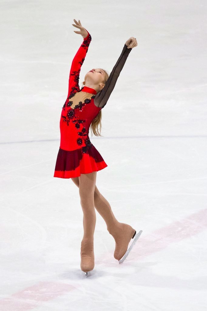 В пятницу вечером, катаясь на коньках под музыку из оперы «Кармен», Загитова была одета в черно-красное кружевное платье с длинными рукавами и эффект дымчатых глаз, созданный косметической компанией.