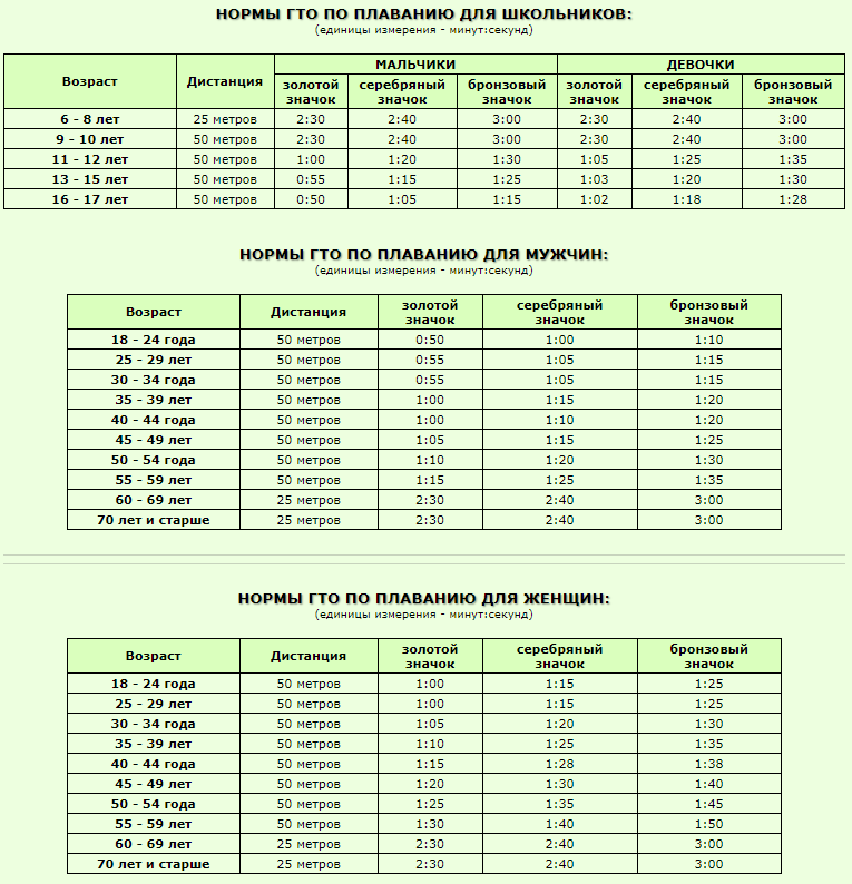 Таблицы нормативов по плаванию