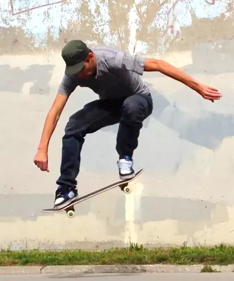 - Наберите разумную скорость и выполните Олли на подушке, перенося вес своего тела на заднюю часть скейтборда в воздухе.